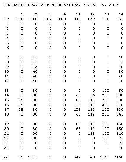 Now for the projections. I just picked a section of this report. Column 14 BSD (Bull Shoals Dam) is the only one we're interested in anyway. Hour 1 starts at midnight, of course. The numbers are represented in MWH. So, for Bull Shoals, it looks like they're going to turn on one generator at about 7:00 AM and throttle it up and down till around 2:00 PM. At this time, they are going to run on 200 / 48.88 = 4.09, which really means 5 gens operating below capacity. At 3:00, 300 / 48.88 = 6.14, or 7 generators, etc.