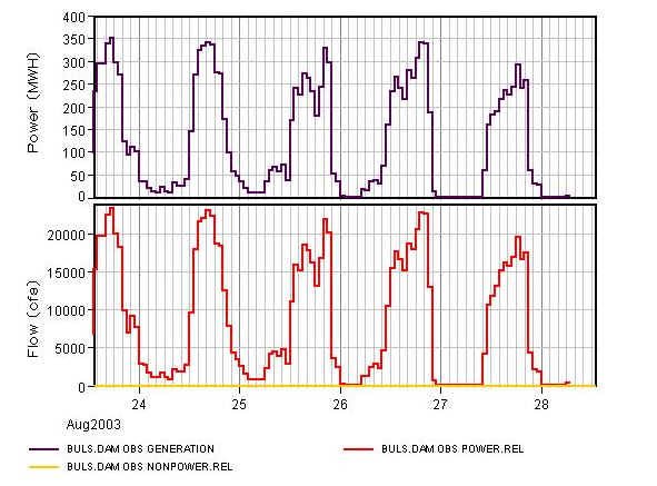 The flow section, as you might imagine, mimics the power generation section. The red line represents a power release, and the yellow line a non-power release. What is a non-power release? When water is run for any other number of reasons, such as a Corps request for example. The generators are not on-line during these releases, as water can be released via the flood gates or slouse pipes instead. Since water is money, this kind of release is not a frequent occurrence.