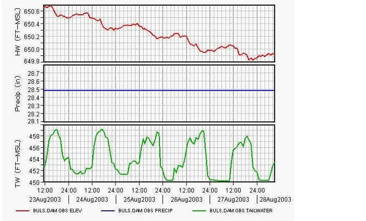 This next section of the graph shows the headwater (lake level), precipitation, and tail water levels (measured just below the dam) for any given 5 day period. In this snapshot I captured, you can see the lake level slowly dropping, no recordable precipitation, and the swings in the tail water caused by the water releases. You can see the trend for this 5 day period has been to release water later in the afternoon. OBS = Observed